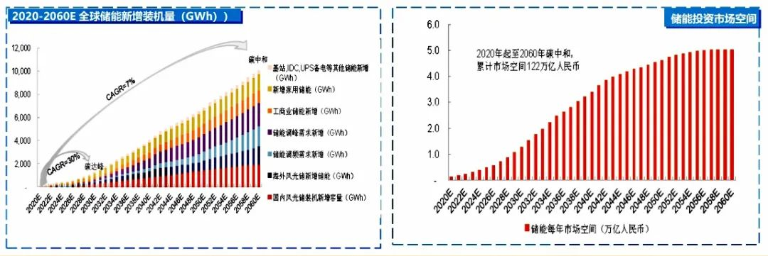 ?2020 Äê´¢Äܳɱ¾Ô¼1.2Ôª/Wh£¬2020 ÄêÆðÀÛ¼Æ1.6ÍòÒÚÔª£¬2025Äê´¢ÄÜͶ×ÊÊг¡¿Õ¼ä0.45ÍòÒÚÔª£¬2030Äê1.3ÍòÒÚÔª(ÀÛ¼Æ6ÍòÒÚÔª)£¬2060 Äê5ÍòÒÚÔª(ÀÛ¼Æ122ÍòÒÚÔª)¡£
